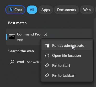 2. Right-click on the Command Prompt option and select Run as administrator.