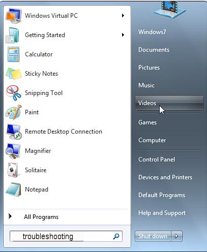 1. Click the Start button and type troubleshooter in the search box.
