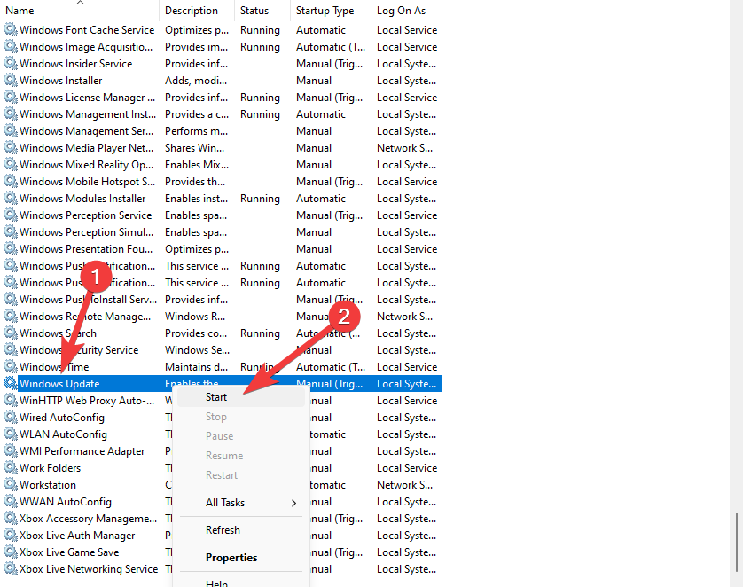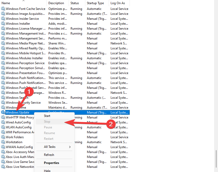 1. Go back to the Windows Update service and right-click on it.
