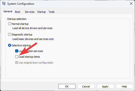 3. Uncheck the Load startup items option.