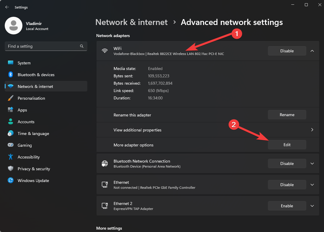 - Click the network connection you’re using, and click the Edit button in the More Adapter Options section.