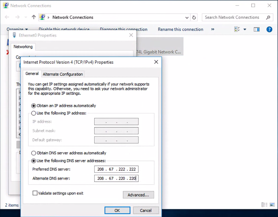 - Choose the Use the following IP address or Use the following DNS server addresses, and enter the values you want to use.