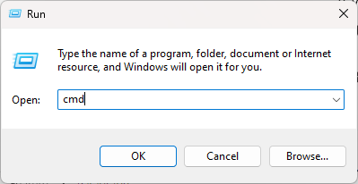 - Type cmd in the Run dialog and press Enter to run the app.
