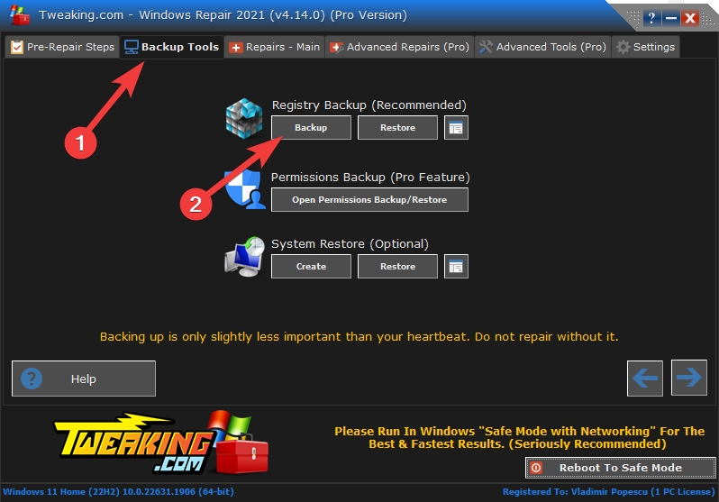 - Open the Backup Tools tab, and press the Backup button under the Registry Backup section.