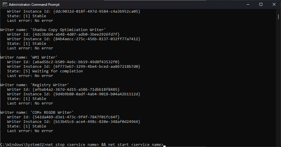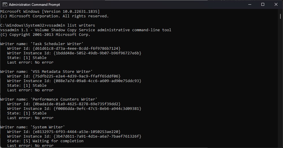 3. Check the writers list and jot down any writers with a failed or unstable state.