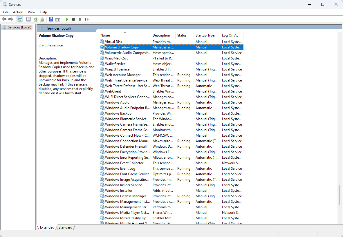 3. Locate the Volume Shadow Copy service, right-click it, and choose Restart.
