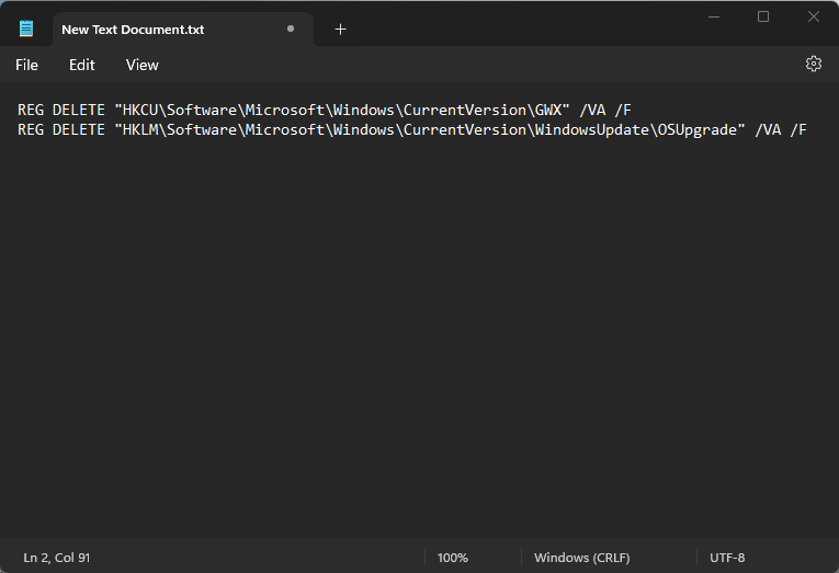 REG DELETE "HKCU\Software\Microsoft\Windows\CurrentVersion\GWX" /VA /F