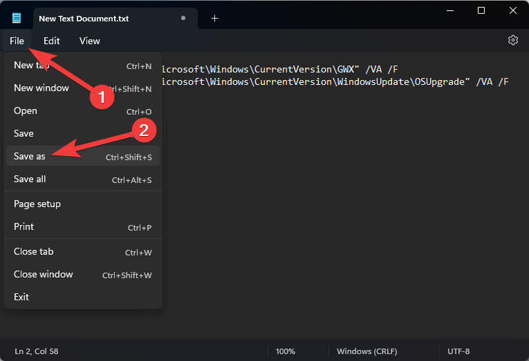 - Click the File menu, choose Save as, and type a name for the file while using a .bat format (e.g., remove_nag_icon.bat).