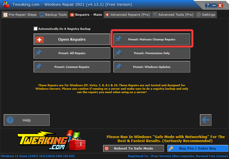 - Always run the Tweaking repairs in Windows Safe Mode – The best approach to ensure that third-party apps remain out of the way and to accelerate the repairs is to run in safe mode.