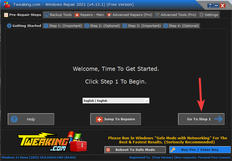 - Click the Go to Step 1 button to start the fixing process.