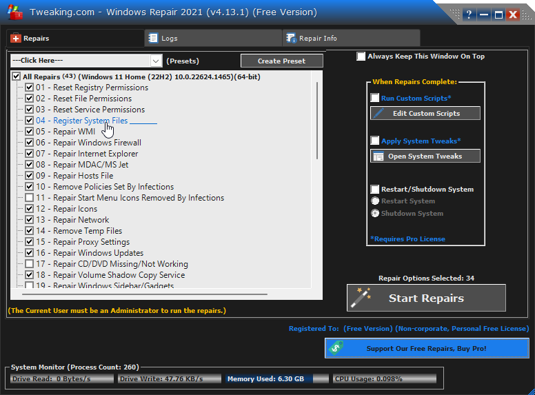- Register System Files: Restores system stability and performance by registering files that might have gone missing or corrupted.