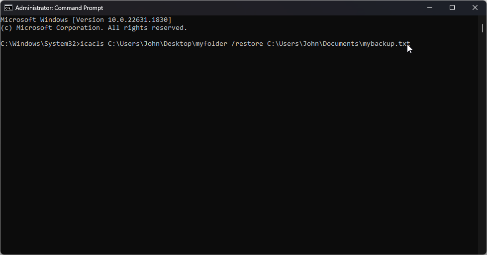 For example: icacls C:\Users\John\Desktop\myfolder /restore C:\Users\John\Documents\mybackup.txt