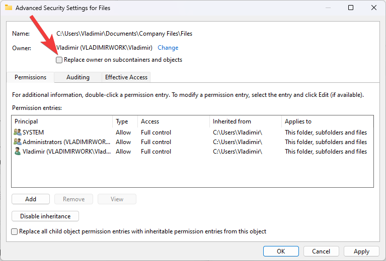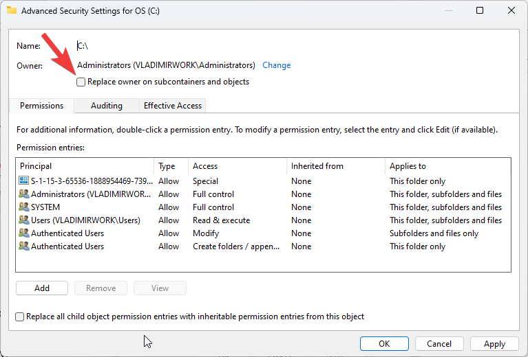 - In the Advanced Security Settings window, check the box next to Replace owner on subcontainers and objects.