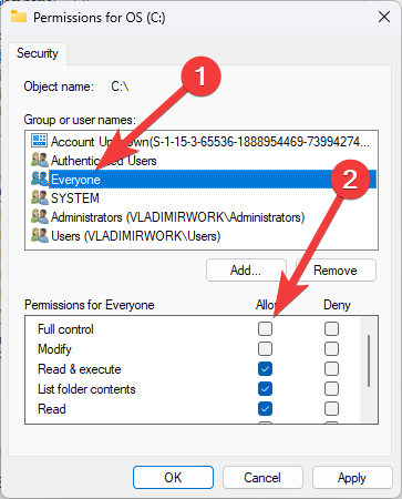 - In the Permissions window, select Everyone and check the box next to Full control under the Allow column.