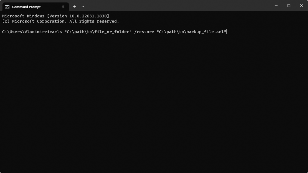 - Type icacls followed by the path of the folder or file you want to restore permissions for, and the /restore switch followed by the path of the backup file.