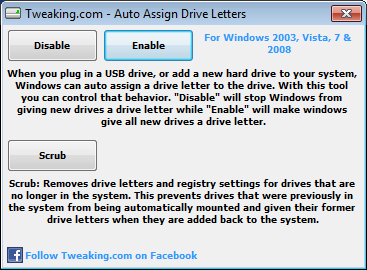 Auto Assign Drive Letters is used to enable & disable the automount feature of Windows. It also has a scrub feature to remove the previous drive letters assigned to drives no longer hooked to the system.