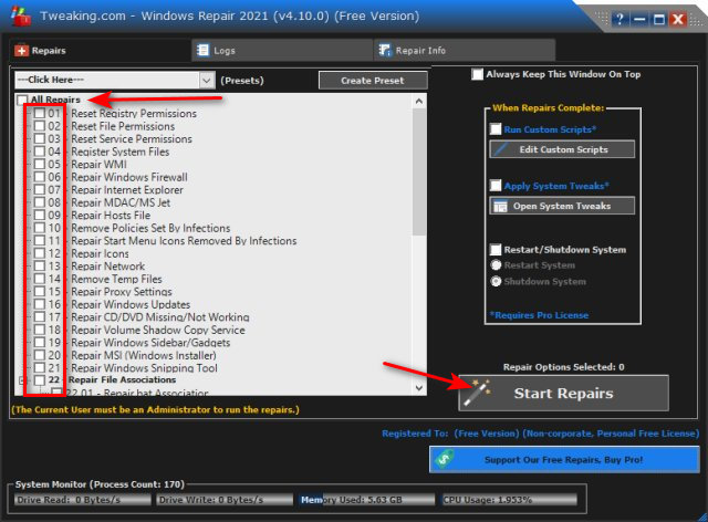 Uncheck the top boxAll Repairs. Scroll down and check the boxes that apply to your problem. Finally, click on Start Repairs. You might also find what you need in the Presets dropdown.