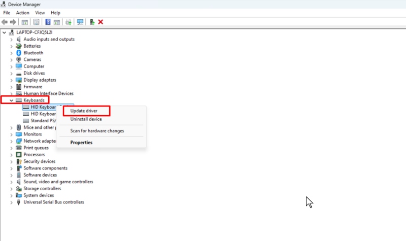 - Right-click on your keyboard device and choose Update driver.