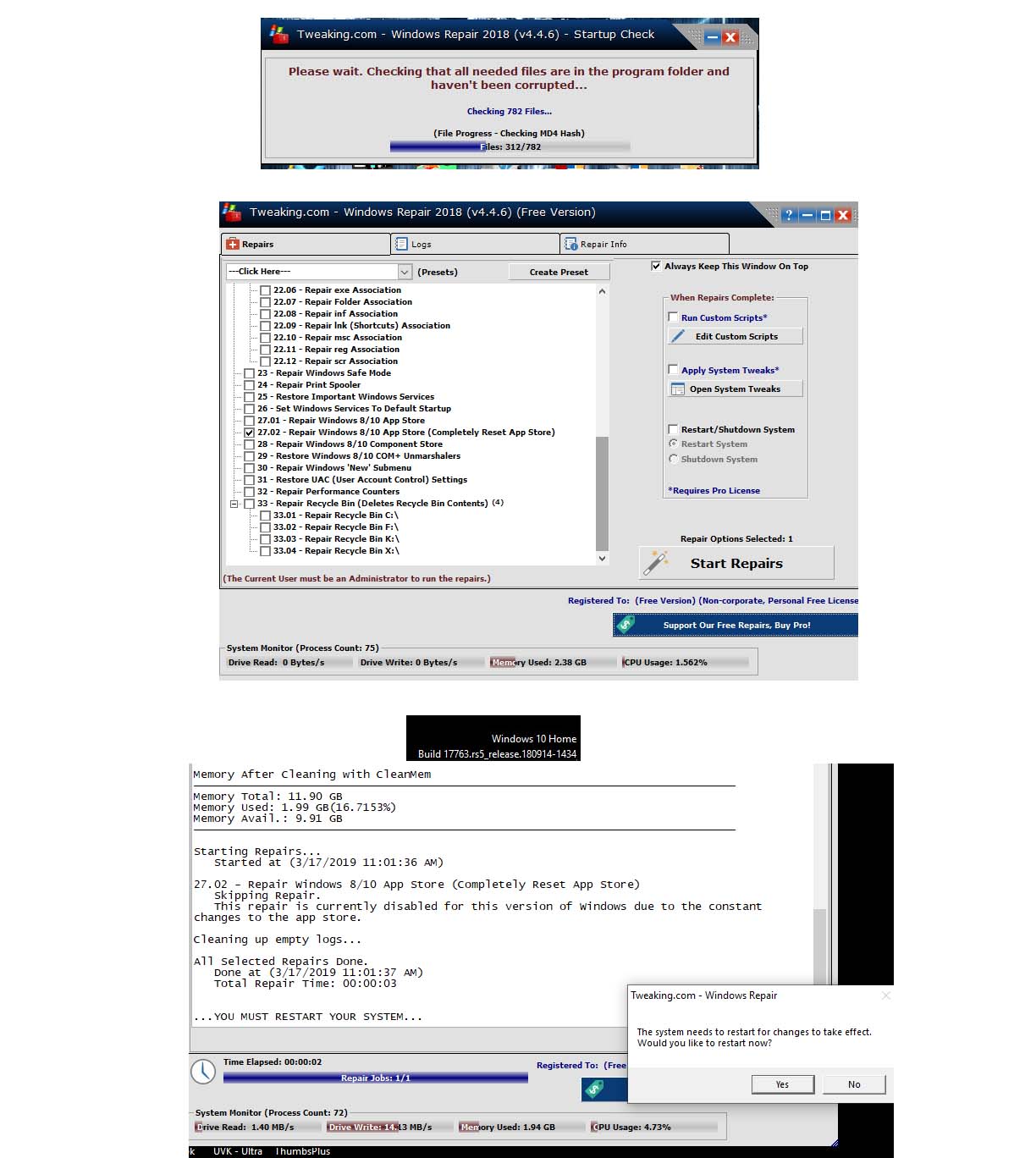 Well I've recently test run 4.4.6 on Win 10 1809 with default repairs set and I didn't get any error messages.