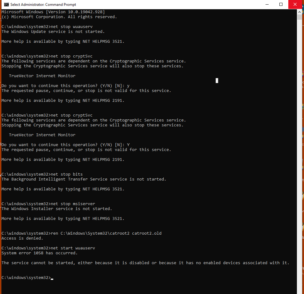 But am still stuck. The "ren C:\Windows\System32\catroot2 catroot2.old" failed with Access Denied and none of the services mentioned could be restarted.