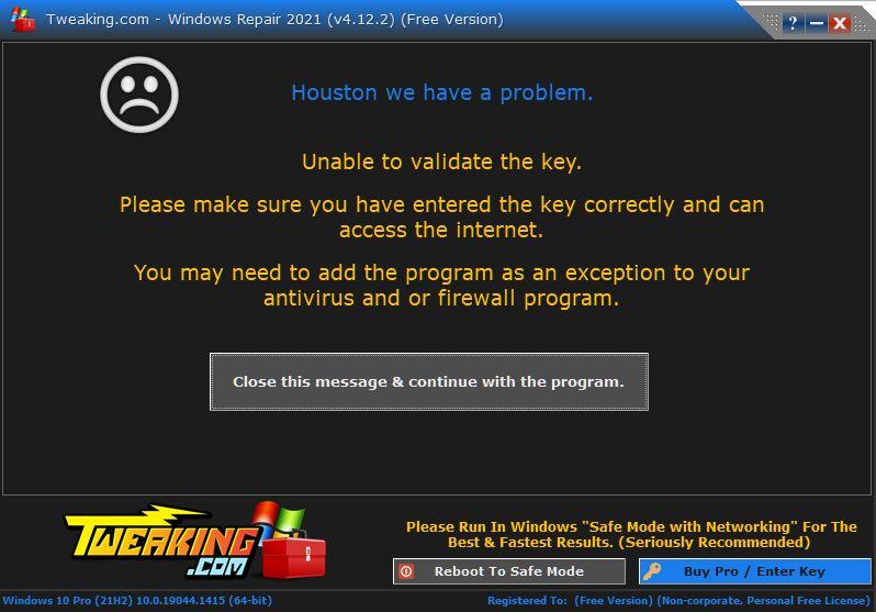I have two PC's (Desktop and Laptop) and both were running the previous version  of WindowsRepair as Pro, but after the upgrade the both are running as "Free Version) with the dreaded "Huston - we have a problem" Pop-up.
