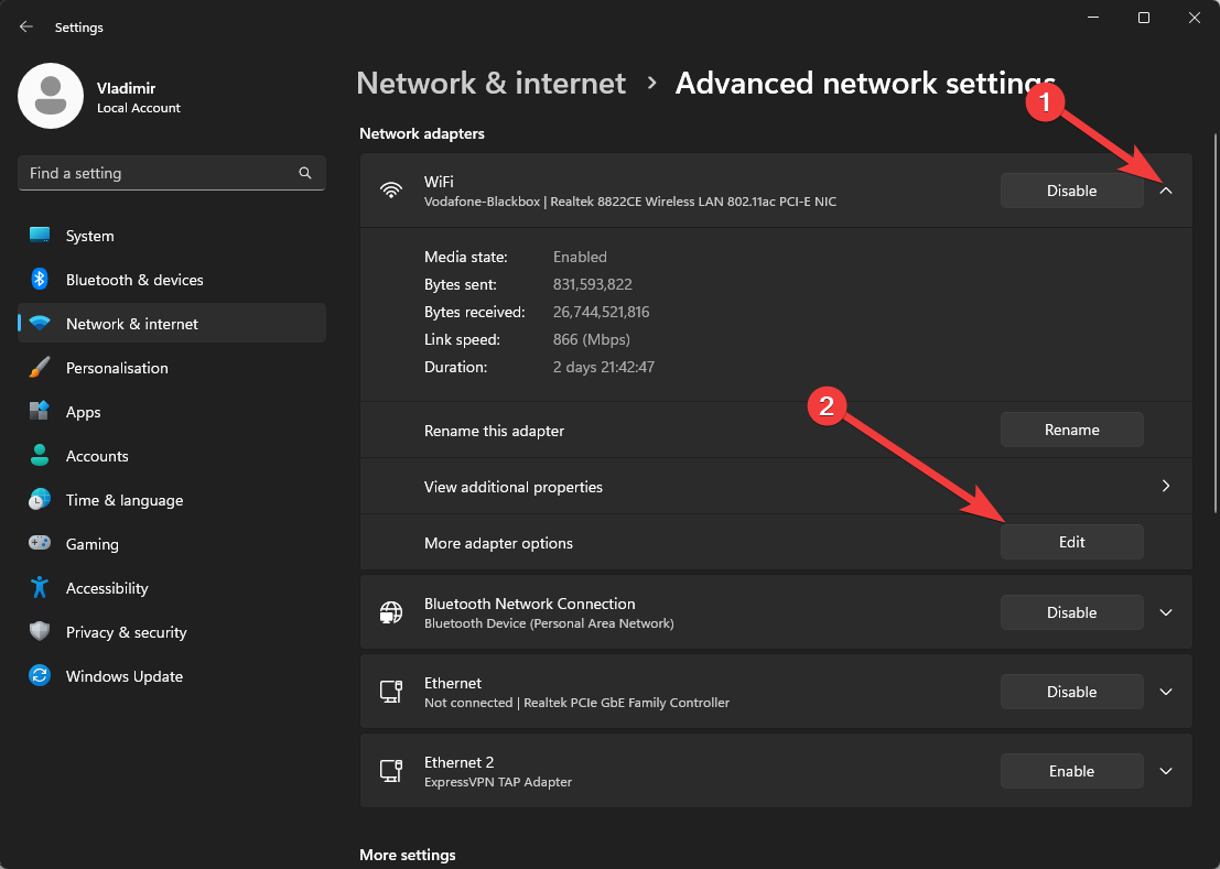 - Toggle the drop-down menu for the network connection you want to modify and choose Edit next to the More Adapter options section.