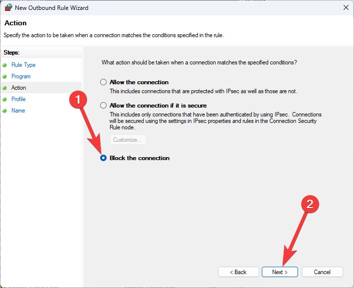 - Choose the Block the connection option and click Next.