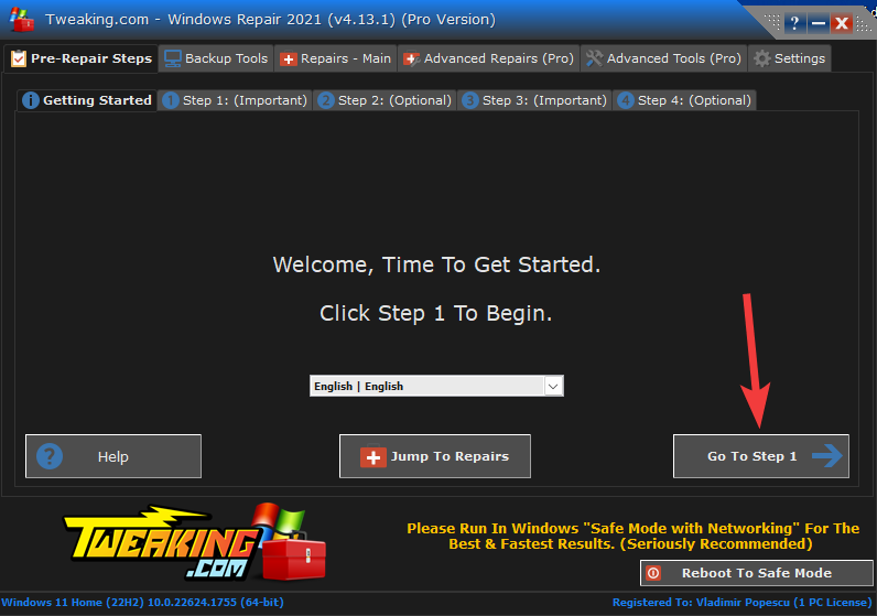 - Click the Go to Step 1 button to start the fixing process.