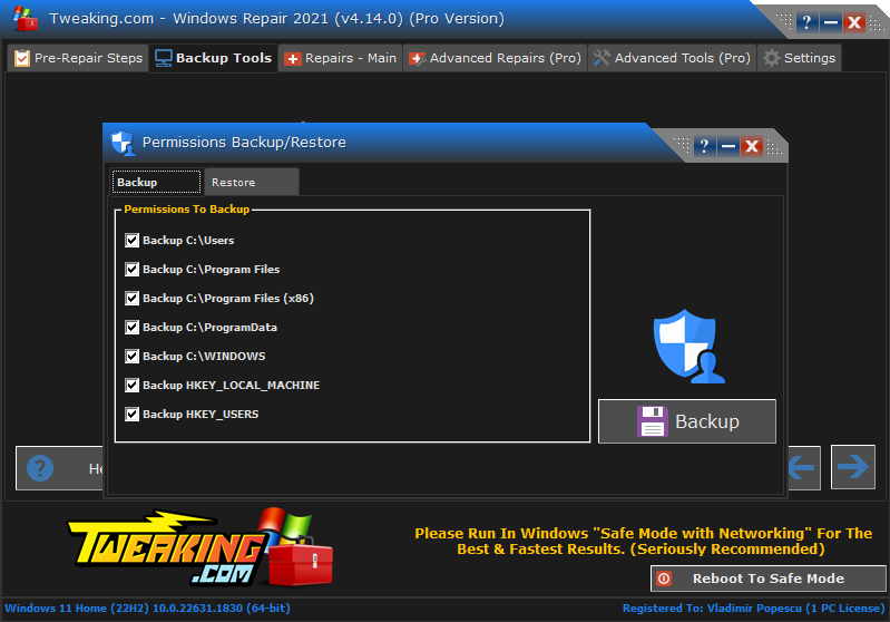 One of the best apps that cover this is Tweaking Repair. This fantastic app doesn’t only automate the process of managing your permissions for backup and restore on your system but also offers a plethora of other valuable tools like system backup, system restore, fixing any corrupted registry files, etc.