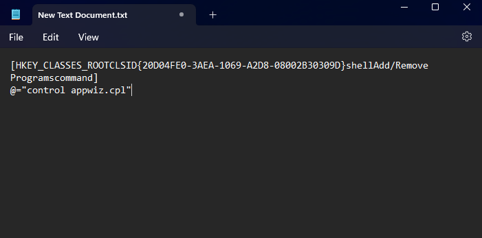 [HKEY_CLASSES_ROOTCLSID{20D04FE0-3AEA-1069-A2D8-08002B30309D}shellAdd/Remove Programscommand]