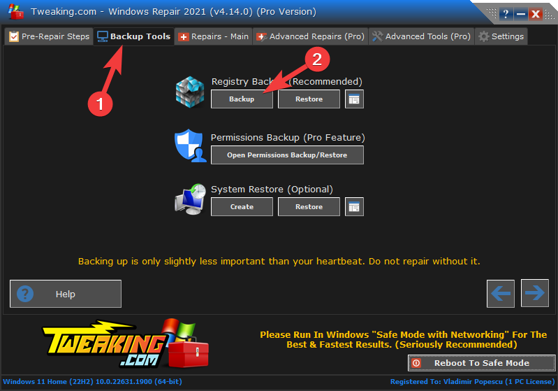 . - Open the software and create a Registry backup by clicking Backup Tools and ten the Backup button.